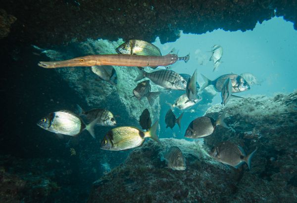Abades Mountain is a Marine Reserve. It is an easy dive perfect for beginners. There's plenty of marine life including trumpet fish, stingray, sponges and sea urchins which cover the rock formations and small caves that divers can explore.